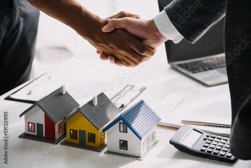Real estate broker agent presenting and consult to customer to decision making sign insurance form agreement, buy and sell home model, concerning mortgage loan offer for and house insurance