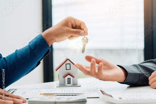 Real Estate Broker Or businessman holding white house model and house key in hand.Mortgage loan approval home loan and insurance concept.
