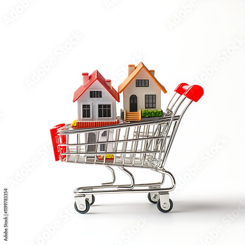Real estate concept with houses in a shopping cart