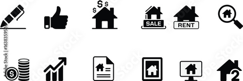Real Estate Icons Vector Set, Houses for Sale and Rent, Financial Symbols, Market Growth and Property Management Concepts, Web Design