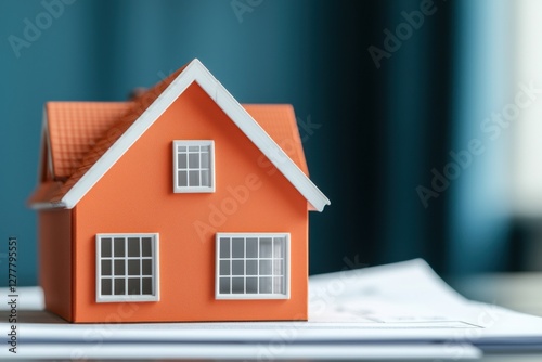 real estate investment checklist document house concept. A small orange model house sits atop documents, representing real estate and home ownership concepts.
