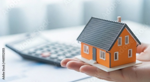 Real Estate Investment Miniature House and Calculator Symbolize Mortgage Planning and Financial Security