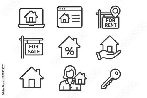Real Estate Line Icon Set, Property for Sale Rent Buy, Agency Website App, House Key, Realtor, Mortgage, Home Ownership, Simple Outline Vector Illustration