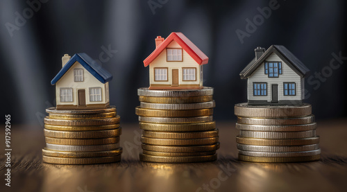 Real estate market growth and property value, with small houses standing on top stacks of coins, against blurred green background