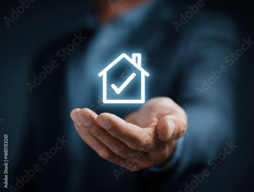 Real estate protection, A person holds a digital house icon with a checkmark, symbolizing approved real estate or property verification in a digital context