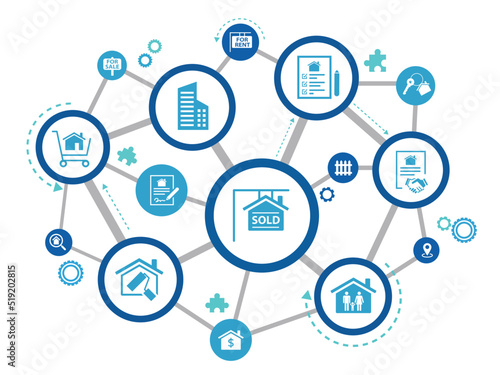 Real estate vector illustration. Concept with connected icons related to property sales and listings, realtor agency and contractor, residential property, investment, housing project
