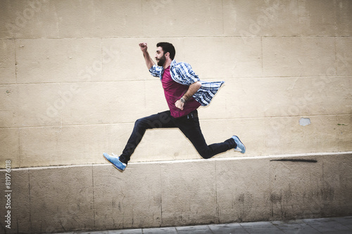 Real man jumping with clear background wall