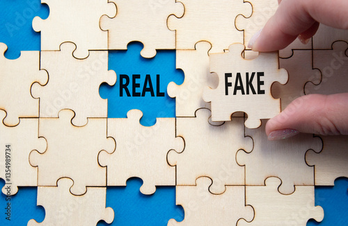 Real or Fake symbol. Concept word Real or Fake on wooden blocks. Businessman hand. Beautiful blue background. Business and Real or Fake concept. Copy space