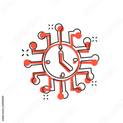 Real time icon in comic style. Clock vector cartoon illustration on white isolated background. Watch business concept splash effect.