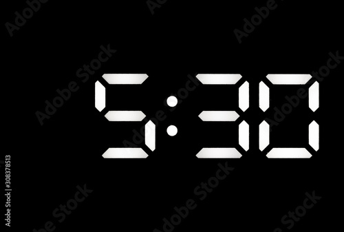 Real white led digital clock on black background
