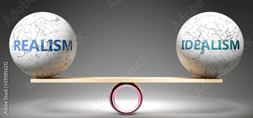 Realism and idealism in balance - pictured as balanced balls on scale that symbolize harmony and equity between Realism and idealism that is good and beneficial., 3d illustration