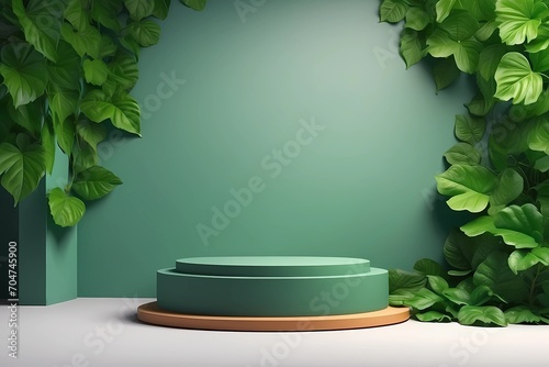 Realistic 3d display podium with green leaf monstera isolated on green background. Generated Ai