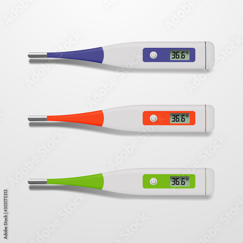 Realistic 3D electronic medical thermometers. Vector illustration.