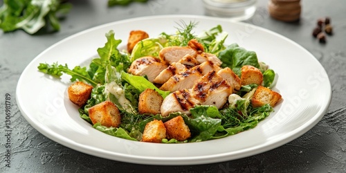 Realistic 3D Mockup of a Delicious Caesar Salad with Grilled Chicken and Croutons, on a White Plate with a Soft Background