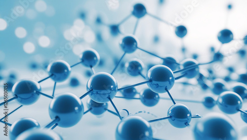Realistic 3D Scientific Illustration of Molecules – Metallic Blue Atoms on Light Blue Bokeh Background