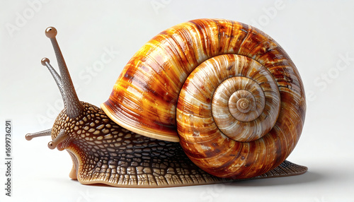 Realistic 3D snail shell icon on white background, detailed texture, lifelike mollusk shell, high-quality 3D rendering, minimalistic natural design element