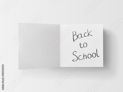 Realistic 3d stack of white stickers with the open page with inscription back to school