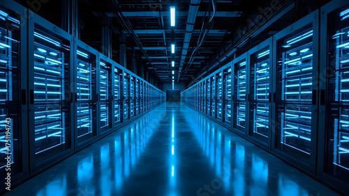 Realistic 8K image of a high-tech data center featuring rows of servers illuminated by glowing blue lights. Sharp focus with subtle reflections on the polished floor, neutral lighting, and a clear cop