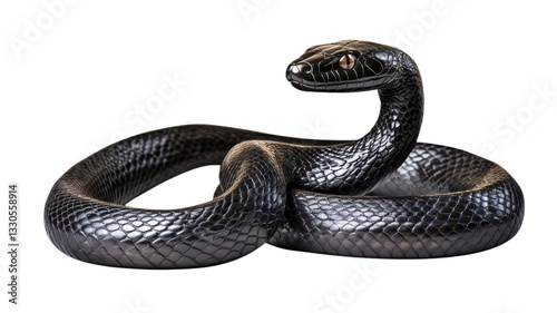 Realistic black snake sculpture with intricate details placed on a simple background, showcasing artistry and craftsmanship in design
