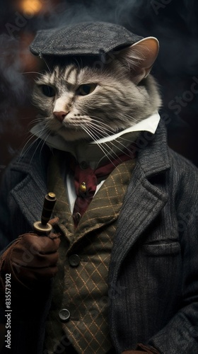 realistic cat as a detective Sherlock Holmes style smoking pipe British, generative ai