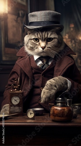 realistic cat as a detective Sherlock Holmes style smoking pipe British, generative ai