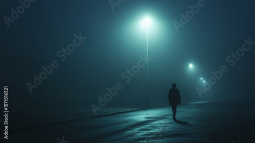 realistic close-up of person walking on empty street in heavy fog, backlit by single streetlamp, cinematic loneliness