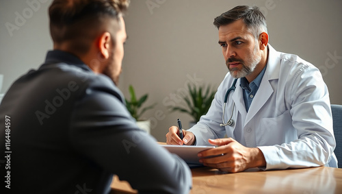 Realistic Close-Up of Professional Physician Consulting a Male Patient in a Medical Office Setting, Physician in Medical Uniform Discussing with Male Patient, Holding Clipboard and Pen.