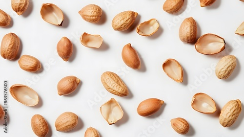 Realistic close-up of scattered peanuts in their shells on a white background, highlighting the rough, textured surface and natural earthy tones with soft shadows