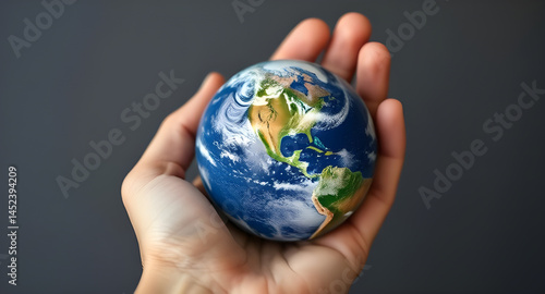 Realistic Earth in Hand Representing Environmental Care and Responsibility Grey Wall Background