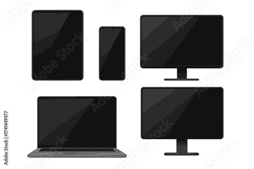 Realistic electronic device set with laptop, monitor, tablet, smartphone. Shiny black blank screens. Vector illustration isolated on white. Gadget mockup template for design.