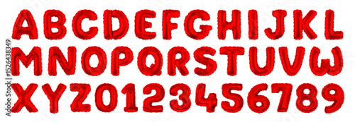 Realistic english alphabet and number balloon for birthday party or wedding invitation social media banner. 3d red air bubble font for school kids coloring book. Christmas plastic paper text or letter