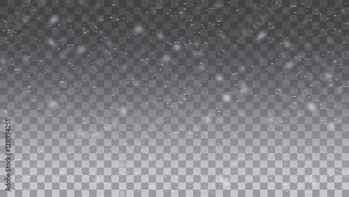 Realistic falling snow with snowflakes. Winter transparent background. Frost storm effect, snowfall, ice. Vector