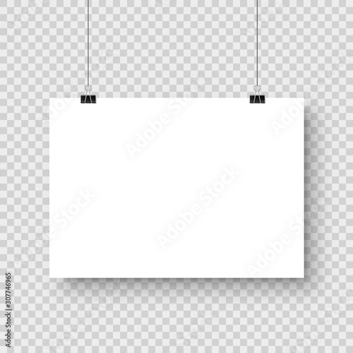 Realistic hanging blank paper sheet with shadow in A4 format and black paper clip, binder on checkered background. Design poster, template or mockup. Vector illustration.