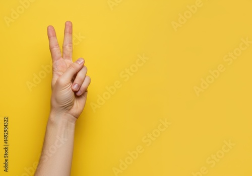 Realistic human hand showing bunny ears gesture, bright plain background, copy space right. Photorealistic visual concept