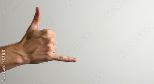 Realistic human hand showing telephone sign, light minimal background, copy space right. Photorealistic visual concept