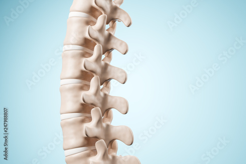 Realistic human spine illustration. Back view on the blue background. 3d render.