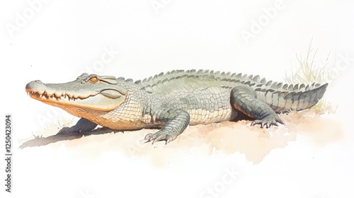 Realistic illustration of a crocodile basking on a sandy shore with soft background colors