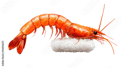 Realistic Illustration of a Vibrant Orange Shrimp on a Bed of Sushi Rice for Culinary Designs