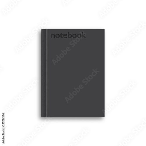 Realistic illustration of black notepad mockup on white background. Vector illustration.