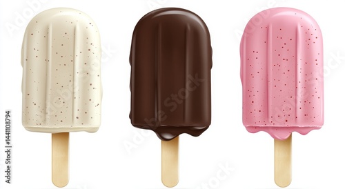 Realistic illustration of melted ice cream isolated on a white background, featuring chocolate with ground nuts and vanilla dessert on a wooden stick, surrounded by a sweet sticky puddle, suitable