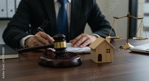 Realistic Image of Gavel House and Scales Balance Law Concept