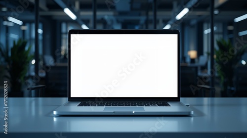 realistic laptop mockup on a clean modern desk, screen showing a minimal landing page layout blank placeholders, no text, blurred office background, glowing blue, black, white gradient