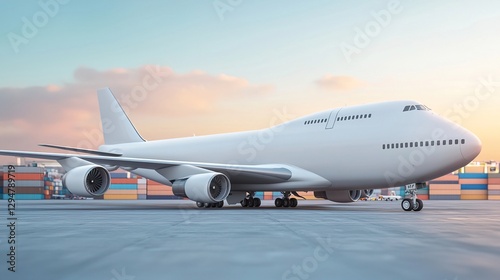 Realistic Large Cargo Plane in Industrial Setting at Sunset, Cargo shipping drives global trade concept.