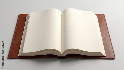 Realistic leather folder with open layout, showing blank pages for brand or design presentations