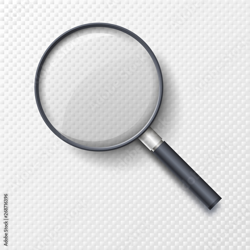 Realistic magnifying glass, magnifier or hand lens for optical magnification isolated on white background. Elegant tool used to magnify image or text. Modern design element. Vector illustration.