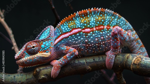 realistic multicolored chameleon with iridescent skin in speckles over black background