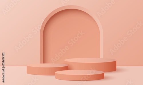 Realistic orange and beige, 3D cylinder stand podium. Vector luxury geometric forms. Abstract minimal scene for Product presentation, mock up, show cosmetic.