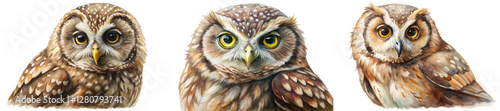 Realistic owl portraits, detailed feathers, vibrant eyes, wildlife illustration, nature art, animal lovers, educational use.