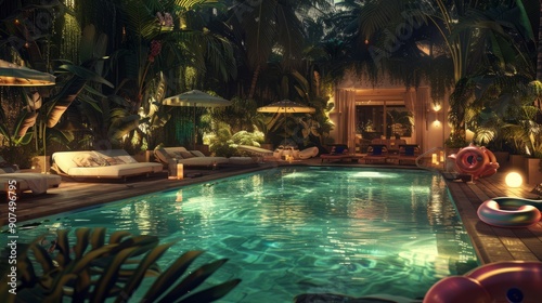 realistic photo in a huge pool with inflatable toys and a deck with sunchairs and a tropical vibe, at night