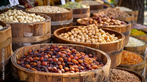 Realistic photo of organic market stall with nuts, seeds, and dried fruits in wooden containers